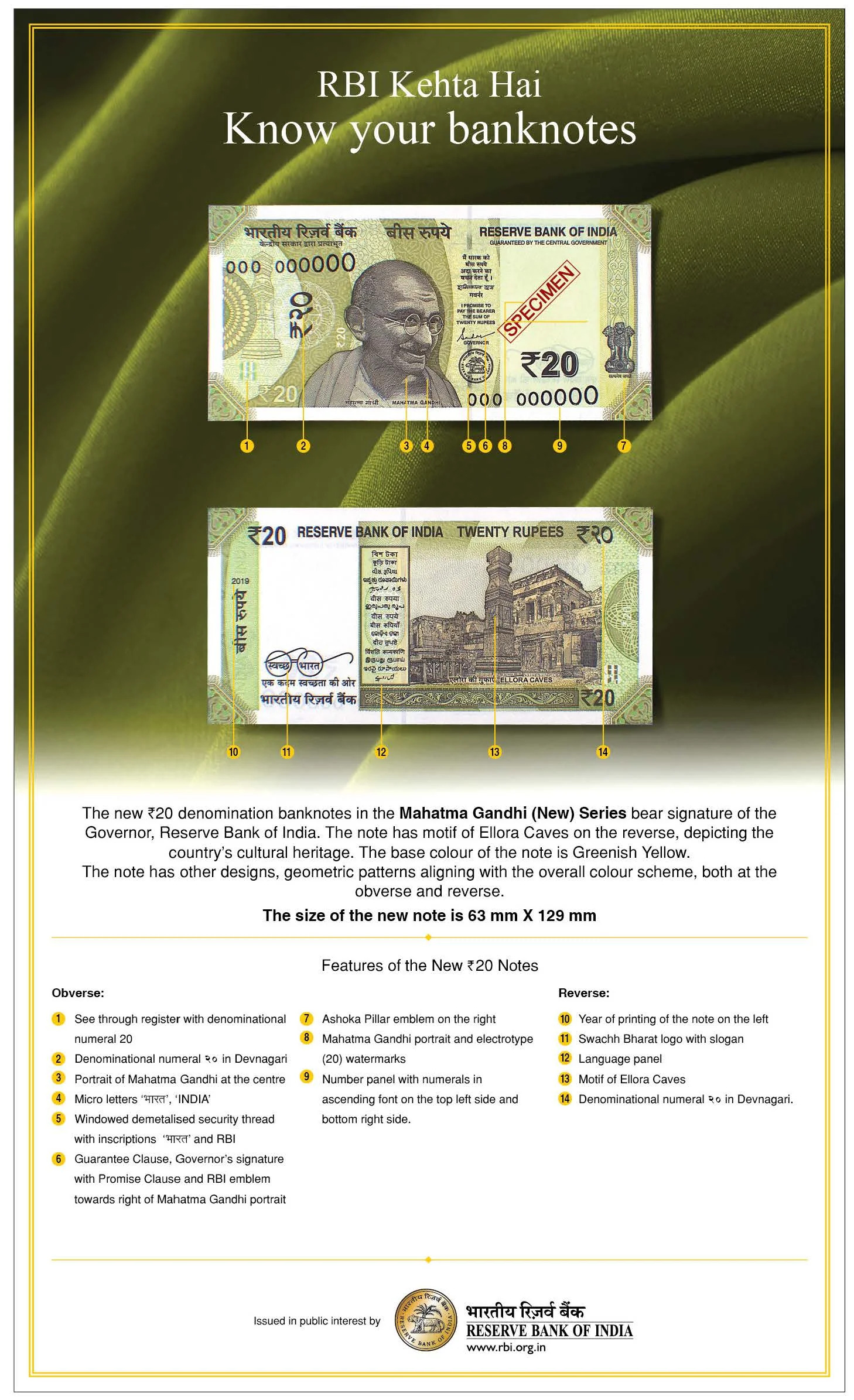 - ব্যাংক নোটের বর্তমান সিরিজে সুরক্ষা ফিচারগুলি যেমন জলছাপ, সিকিউরিটি থ্রেড, ডিনমিনেশন সংখ্যার আবছা ইমেজ, রং বদলে যাওয়া কালিতে ডিনমিনেশন সংখ্যা, নাম্বার প্যানেল, স্বচ্ছ রেজিস্টার, ইলেকট্রো-টাইপ, ব্লিড লাইন প্রভৃতি বজায় থাকছে, তাদের সংশ্লিষ্ট অবস্থান হয়তো বদলাতে পারে নতুন নোটগুলিতে।