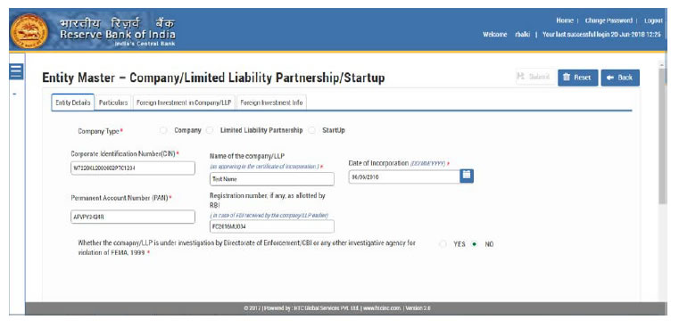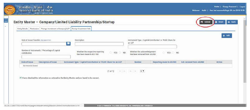 The Entity User would be the sole person authorized to add/update the foreign investment details of an Entity in the Entity Master and would be entirely responsible for the data entered.