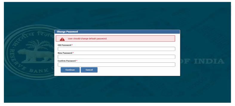 Step 1: Enter User Name and Password as provided to the User in the email from RBI and click Login. The user would be asked to change his/her password upon first Login.