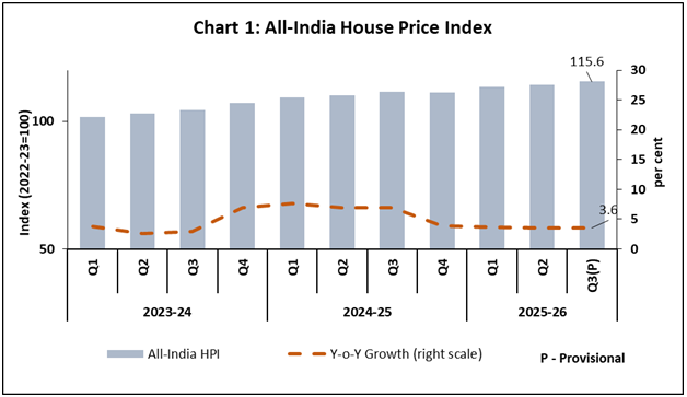 The Reserve Bank of India (RBI) compiles the House Price Index (HPI) on a quarterly basis using transaction-level data received from the registration authorities. Today, the RBI released1 the HPI for Q3:2025-26 with base year as 2022-23, covering eighteen major cities2. Highlights: