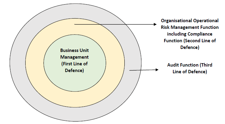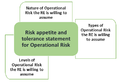 4.7 The Board of Directors and Senior Management of RE should understand the nature and complexity of the risks inherent in the portfolio of RE’s new business initiatives, products, services, activities, processes, and systems, which is a fundamental premise of sound risk management. This is particularly important for Operational Risk, as it is inherent in all business products, services, activities, processes, and systems. ![]() 4.8 The components of the ORMF should be fully integrated into the overall risk management processes of the RE by the first line of defence, adequately challenged and reviewed by the second line of defence, and independently reviewed by the third line of defence. The ORMF should be embedded across all levels of the RE including group and business units as well as new business initiatives, products, services, activities, processes, and systems. In addition, results of the RE’s Operational Risk assessment should be incorporated into the RE’s overall business strategy development process. The overall approach to ORMF should reflect the following: 4.8.1 Management of Operational Risk is embedded within business lines of an RE. 4.8.2 Senior managers are responsible for management and ownership of Operational Risk across RE’s end-to-end processes. 4.8.3 Board is ultimately responsible and accountable for oversight of Operational Risk Management. 4.9 The ORMF should be comprehensively and appropriately documented in Board of Directors approved policies and include definitions of Operational Risk and operational loss. If REs do not adequately describe and classify Operational Risk and loss exposure, it would result in significantly reducing the effectiveness of their ORMF. 4.10 ORMF documentation should clearly: 4.10.1 identify the governance structures used to manage Operational Risk, including reporting lines and accountabilities, and the mandates and membership of the Operational Risk governance committees; 4.10.2 reference the relevant Operational Risk Management policies and procedures; 4.10.3 describe the tools for risk and control identification and assessment and the role and responsibilities of the three lines of defence in using them; 4.10.4 describe the RE’s accepted Operational Risk appetite and tolerance; the thresholds, material activity triggers or limits for inherent and residual risk; and the approved risk mitigation strategies and instruments; 4.10.5 describe the RE’s approach to ensure controls are designed, implemented and operate effectively; 4.10.6 describe the RE’s approach to establishing and monitoring thresholds or limits for inherent and residual risk exposure; 4.10.7 describe inventory risks and controls implemented by all business units (e.g., in a control library); 4.10.8 establish risk reporting and management information systems (MIS) for producing timely, and accurate data; 4.10.9 provide for a common taxonomy of Operational Risk terms to ensure consistency of risk identification, exposure rating and risk management objectives across all business units. The taxonomy can distinguish Operational Risk exposures by event types, causes, materiality and business units where they occur; it can also flag those operational risk exposures that partially or entirely represent legal, conduct, model and ICT (including cyber) risks as well as exposures in the credit or market risk boundary; 4.10.10 provide for appropriate independent review and challenge of the outcomes of the risk management process; and 4.10.11 require the policies to be reviewed and revised as appropriate based on continued assessment of the quality of the control environment addressing internal and external environmental changes or whenever a material change in the Operational Risk profile of the RE occurs. 5. Responsibilities of Board of Directors and Senior Management