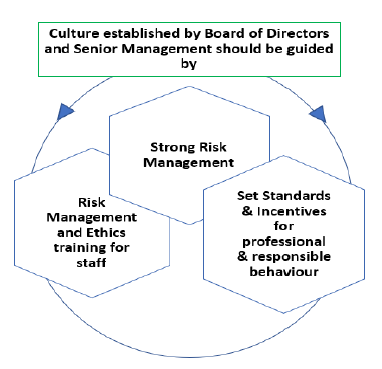 4.1 REs with a strong culture of risk management and ethical business practices are less likely to experience damaging Operational Risk events and are better placed to effectively deal with those events that occur. The actions of the Board of Directors and Senior Management as well as the RE’s risk management policies, processes and systems provide the foundation for a sound risk management culture. 4.2 The Board of Directors should establish a code of conduct or an ethics policy to address conduct risk. This code or policy should be applicable to both staff and Board members. It should set clear expectations for integrity and ethical values of the highest standard, identify acceptable business practices, and prohibit conflicts of interest or the inappropriate provision of financial services (whether wilful or negligent). It should be regularly reviewed and approved by the Board of Directors and attested by employees. Its implementation should be overseen by a senior ethics committee, or another Board-level committee, and should be publicly available (e.g., on the RE’s website, branch premises). A separate code of conduct may be established for specific positions in the RE (e.g., treasury dealers etc.). ![]() 4.3 Senior Management should set clear expectations and define accountabilities to ensure RE’s staff understand their roles and responsibilities of risk management, as well as their authority to act. 4.4 Compensation policies should be aligned to the RE’s statement of risk appetite and tolerance as well as overall soundness of risk management framework, and appropriately balance risk and reward. Inappropriate incentives may result in increased litigation, reputational risk, or other risks to the RE. Therefore, the RE should review whether its existing governance and controls are adequate in light of risks arising from incentive arrangements. 4.5 Senior Management should ensure that an appropriate level of Operational Risk training is available at all levels throughout the organisation, such as heads of business units, heads of internal controls and senior managers. Training provided should reflect the seniority, role and responsibilities of the individuals for whom it is intended. It should also appropriately include ethics training. 4.6 Strong and consistent support of the Board of Directors and Senior Management for operational risk management coupled with ethical behaviour convincingly reinforces codes of conduct and ethics, compensation strategies, etc.