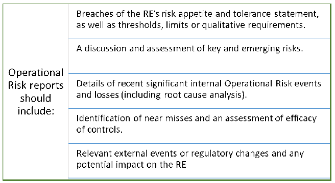 8.1 An RE should ensure that its reports are comprehensive, accurate, consistent and actionable across business units and products. To this end, the first line of defence should ensure reporting on any residual Operational Risks, including Operational Risk events, control deficiencies, process inadequacies, and non-compliance with Operational Risk tolerances. Reports should be manageable in scope and volume by providing an outlook on the RE’s Operational Risk profile and adherence to the Operational Risk appetite and tolerance statement; effective decision-making is impeded by both excessive amounts and paucity of data. 8.2 Reporting by RE should be timely and should be able to produce reports in both normal and stressed market conditions.9 The frequency of reporting should reflect the risks involved and the pace and nature of changes in the operating environment. The results of monitoring activities should be included in regular management and Board reports, as should assessments of the ORMF performed by the internal/external audit and/or risk management functions. Reports generated by or for supervisory authorities should also be reported internally to Senior Management and the Board of Directors. 8.3 Operational Risk reports should describe the Operational Risk profile of the RE by providing internal financial, operational, and compliance indicators, as well as external market or environmental information about events and conditions that are relevant to decision making. ![]() 8.4 Data capture and risk reporting processes should be analysed periodically with the goal of enhancing risk management performance as well as advancing risk management policies, procedures and practices. 8.5 Further, Senior Management should provide timely reports to the Board on the ongoing operational resilience of the RE’s business units to support the Board’s oversight, particularly when significant deficiencies could affect the delivery of the RE’s critical operations.