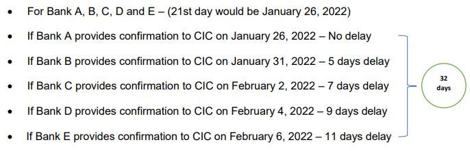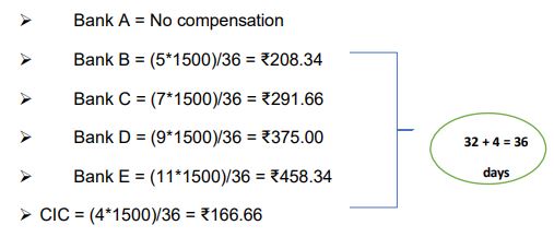 Explanation: The delay of six days shall be apportioned by the CIs/CICs on weighted average of the extent of delay by each CIs/CICs. In the above case, the overall delay is 6 days and therefore the complainant shall be entitled for total compensation of ₹600. This needs to be apportioned between all the defaulting banks (in this case Bank B, C, D and E). Cumulatively, the delay of all the defaulting banks put together is 32 days (5+7+9+11 days). Therefore, the compensation amount of ₹600 shall be apportioned on weighted average of the delay by each CIs in relation to the overall delay of 32 days in this case.