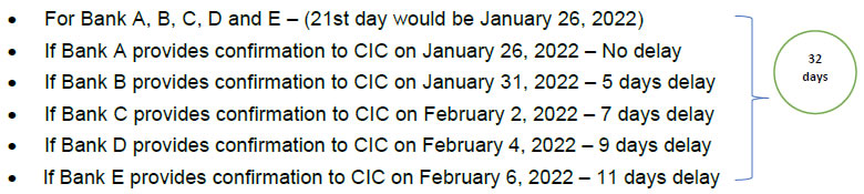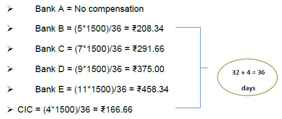 Explanation: The delay of six days shall be apportioned by the CIs/CICs on weighted average of the extent of delay by each CIs/CICs. In the above case, the overall delay is 6 days and therefore the complainant shall be entitled for total compensation of ₹600. This needs to be apportioned between all the defaulting banks (in this case Bank B, C, D and E). Cumulatively, the delay of all the defaulting banks put together is 32 days (5+7+9+11 days). Therefore, the compensation amount of ₹600 shall be apportioned on weighted average of the delay by each CIs in relation to the overall delay of 32 days in this case.