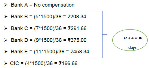Explanation: The delay of six days shall be apportioned by the CIs/CICs on weighted average of the extent of delay by each CIs/CICs. In the above case, the overall delay is 6 days and therefore the complainant shall be entitled for total compensation of ₹600. This needs to be apportioned between all the defaulting banks (in this case Bank B, C, D and E). Cumulatively, the delay of all the defaulting banks put together is 32 days (5+7+9+11 days). Therefore, the compensation amount of ₹600 shall be apportioned on weighted average of the delay by each CIs in relation to the overall delay of 32 days in this case.