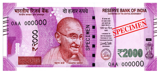 The Reserve Bank of India will shortly issue ₹ 2000 denomination banknotes in the Mahatma Gandhi (New) Series, without the inset letter, bearing signature of Dr. Urjit R. Patel, Governor, Reserve Bank of India, and the year of printing '2016' printed on the reverse of the banknote. The new denomination has Motif of Mangalyaan on the reverse, depicting the country’s first venture into the interplanetary space. The base colour of the note is magenta. The note has other designs, geometric patterns aligning with the overall colour scheme, both at the obverse and reverse. ![]() ![]() The salient features of the banknotes will be as under: