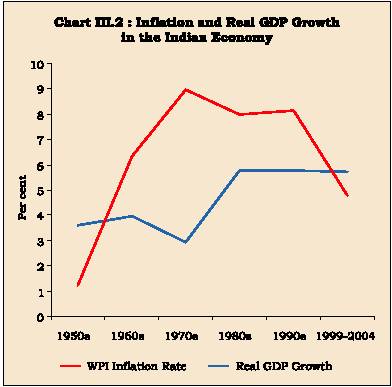 however, varied over time depending on the evolving price-output situation. Initially, this was guided by the concept of developmental central banking crystallised in the First Five Year Plan, which required the Reserve Bank to create an institutional framework for industrial as well as rural credit to support economic growth (GoI,1951)2. This reflected a widespread consensus that public investment could spur rapid growth. The concomitant deficit financing associated with public investment began to spill over into inflation and concerns began to be expressed over the inflationary consequences of the fiscal deficit during the 1960s (Iengar, 1959; Rama Rau, 1960; Narasimham, 1968). These concerns gathered momentum during the 1970s as inflation trended up to around nine per cent during the 1970s (Chart III.2). Against this backdrop of persistent high inflation, the Chakravar ty Committee recommended that price stability emerge as the 'dominant' objective of monetary policy with a concomitant commitment to fiscal discipline (RBI, 1985)3. Besides the conventional wisdom that fluctuations in prices affected business decisions, inflation was also seen as a social injustice, especially as the poor seldom had hedges against inflation (Rangarajan, 1988).
