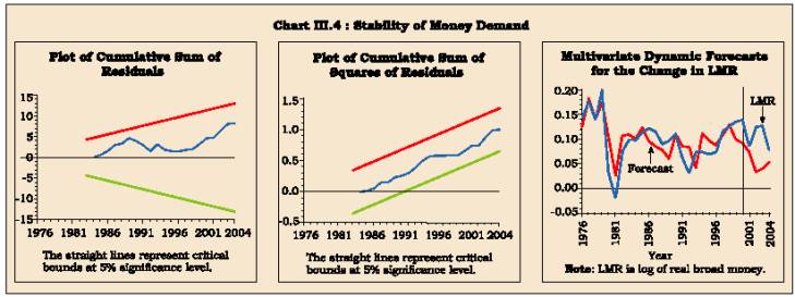 Following this, the short-run dynamics are examined using an error correction model. Results indicate that real GDP and interest rates are weakly exogenous to the system. As regards real money, the error correction results show that the coefficient on the error correction term is negative and statistically significant (t-value is 4.0)8 . Stability properties of the short-run model are examined by employing CUSUM and CUSUM SQUARE tests. Both these tests indicate that the path of the parameters has been within the two standard error bands (Chart III.4). While this supports the stability of the parameters, the path of the parameters is not exactly horizontal. However, as noted by the Working Group on Money Supply (RBI, 1998), the predictive stability is equally important. Towards this purpose, the model is re-estimated up to 1999-2000 and multivariate dynamic forecasts for change in broad money are evaluated. As Chart III.4 indicates, the model under-predicts the demand for money. A number of factors may explain this behaviour. First, inflation has come down significantly since the second half of the 1990s and this could have increased the real demand for money. Second, monetary aggregates are inclusive of nonresident deposits and movements in these deposits have varied a lot from year-to-year, mainly in response to policy efforts to modulate these deposits. Third, the mergers in the banking industry have provided a jump to monetary aggregates. From these factors, it is evident that in the short-run, there can be deviations from the long-run equilibrium relationship. These results thus support the conclusions of RBI (1998) that monetary policy based solely on broad money could lack precision. At the same time, given the long-run relationship, there is a role for monetary aggregates to play. Accordingly, a multiple indicator approach in which broad money remains an important information seems to be appropriate.