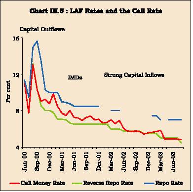 3.63 Persistent capital inflows that India experienced since 2001-02 posed a challenge to the LAF operations. In view of large capital flows, the LAF emerged as the key instrument of managing capital flows through sterilisation. This was reflected in the outstanding reverse repo amount which increased from Rs.2,415 crore as at end-March 2003 to Rs. 62,995 crore by late March 2004 and further to Rs. 89,435 crore by mid-April 2004. Thus, instead of absorbing liquidity of a short-term and temporary nature, the LAF window was absorbing funds of a relatively more enduring nature. In order to address these issues, an Internal Group of the Reserve Bank reviewed the operations of the LAF in a cross-country perspective, keeping in view recent developments in the financial markets as well as in technology. The Group noted that it is difficult to distinguish