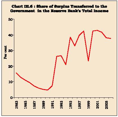 The structural changes in the composition of the Reserve Bank's assets were reflected in an increase in the share of income from foreign sources in total income. Besides, changes in the manner of conducting monetary operations have impacted the composition of income from domestic sources. Furthermore, financial market deregulation has enhanced the interest sensitivity of domestic income. The Reserve Bank's total income declined to 2.3 per cent of its assets as at end-June 2004 from 3.7 per cent during 1990-91, reflecting mainly the dominance of foreign currency assets, which carry relatively lower interest in comparison with domestic assets comprising largely Government securities (RBI, 2004b). Total expenditure declined to 1.3 per cent of assets as at end-June 2004 from 2.6 per cent as at end-June 1991, mainly as a result of decline in the interest outgo on the eligible CRR balances. The share of the surplus transferred to the Government in the total income has increased during the latter half of the 1990s but simultaneously with higher transfers to internal reserves (Chart III.6).
