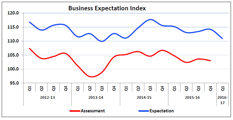 1The 72nd round (Q3:2015-16) survey results were released on January 15, 2016 on the RBI website. The survey results are those of the respondents and are not necessarily shared by the Reserve Bank of India. 2Net Response (NR) is the difference of percentage of the respondents reporting optimism and that reporting pessimism. The range is -100 to 100. Any value greater than zero indicates expansion/optimism and any value less than zero indicates contraction/pessimism i.e., NR = (I – D); where, I is the percentage response of ‘Increase/optimism’, and D is the percentage response of ‘Decrease/pessimism’ and E is the percentage response as ‘no change/Equal’; I+D+E=100. For example, increase in production is optimism whereas decrease in cost of raw material is optimism. 3The Business Expectation Index (BEI) is a composite indicator calculated as weighted (share of GVA of different industry group) net response of nine business indicators. The nine indicators considered for computation of BEI are: (1) overall business situation, (2) production, (3) order books, (4) inventory of raw material, (5) inventory of finished goods, (6) profit margin, (7) employment, (8) exports and (9) capacity utilisation. It gives a single snapshot of business outlook in every quarter. BEI lies between 0 to 200, and 100 is the threshold separating expansion from contraction. | |||||||||||||||||||||||||||||||||||||||||||||||||||||||||||||||||||||||||||||||||||||||||||||||||||||||||||||||||||||||||||||||||||||||||||||||||||||||||||||||||||||||||||||||||||||||||||||||||||||||||||||||||||||||||||||||||||||||||||||||||||||||||||||||||||||||||||||||||||||||||||||||||||||||||||||||||||||||||||||||||||||||||||||||||||||||||||||||||||||||||||||||||||||||||||||||||||||||||||||||||||||||||||||||||||||||||||||||||||||||||||||||||||||||||||||||||||||||||||||||||||||||||||||||||||||||||||||||||||||||||||||||||||||||||||||||||||||||||||||||||||||||||||||||||||||||||||||||||||||||||||||||||||||||||||||||||||||||||||||||||||||||||||||||||||||||||||||||||||||||||||||||||||||||||||||||||||||||||||||||||||||||||||||||||||||||||||||||||||||||||||||||||||||||||||||||||||||||||||||||||||||||||||||||||||||||||||||||||||||||||||||||||||||||||||||||||||||||||||||||||||||||||||||||||||||||||||||||||||||||||||||||||||||||||||||||||||||||||||||||||||||||||||||||||||||||||||||||||||||||