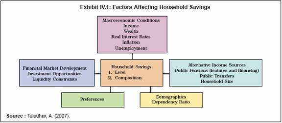 4.12 Finally, since household savings form a potential pool of resources for intermediation by banks, the evolving dynamics in determinants of household savings have a critical bearing on banks in their management of resource mobilisation. While the banks’ accessibility of resources is expected to grow in tandem with the increasing level of household savings, the actual recourse of the same would depend upon the households’ decisions on their portfolio composition of savings. The level and composition of household savings, in turn, are influenced by macroeconomic conditions, financial market development and regulation, alternative income sources, demographics and preferences of the household sector (Exhibit 1). Cross-country evidence on asset composition of household balance sheets reveals that non-financial assets constitute a major share in total assets in countries where developments in housing sectors have opened up new investment opportunities. On the other hand, the composition shifts in favour of financial assets in countries with well developed financial markets, partly facilitated by relatively cheap housing and extensive reliance on private pension plans. Within financial assets, the preference for liquid assets held mostly in the form of bank deposits is observed to be high in countries with a long history of public confidence in banking, which is also influenced, to an extent, by lack of confidence in the real estate and capital markets (Davies, et. al., 2007).