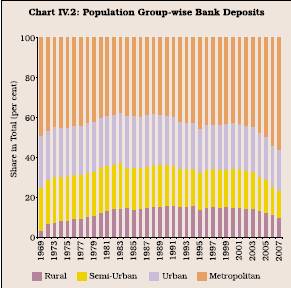 4.20 As a result, the share of rural deposits in total deposits increased from 3.1 per cent in 1969 to 14.4 per cent by 1984, which was primarily responsible for raising the overall deposit growth during the period 1969-1984. Similarly, the shares of semi-urban and urban deposits also increased somewhat up to the mid-1980s. On the other hand, the share of metropolitan deposits in total deposits declined sharply from 49 per cent to around 39 per cent over the same period (Chart IV.2).