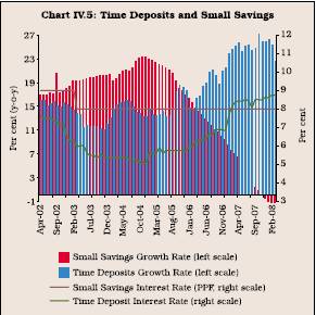 4.39 In the fourth phase 2005-06 to 2007-08, deposit growth accelerated on account of acceleration in both demand and time deposits (refer Table 4.4). With a pick-up in growth momentum from 2003-04, credit demand from banks increased on a sustained basis, leading banks to devise strategies for aggressive deposit mobilisation. The sharp acceleration in demand deposits in this phase reflected, to some extent, the increase in the balances in current account in tandem with the increased offtake of bank credit as also parking of funds by mutual funds and corporates in view of buoyant capital market conditions. Insofar as time deposits are concerned, in order to provide level playing field, the Government in the Union Budget 2006-07 also extended the tax benefits under Section 80C for fixed deposits in scheduled banks with maturity of five years and above (Box IV.2). In view of sustained growth in credit offtake from banks at a higher level since 2004-05, banks also began to raise interest rates on term deposits of different maturity above the small savings rates to improve the attractiveness of various deposit schemes. However, interest rates on post office deposits remained unchanged (refer Table 4.9). Accordingly, the interest rate differentials narrowed down initially and subsequently turned in favour of bank deposits. As a result, there was a shift of funds from small savings to bank deposits (refer Chart IV.5).
