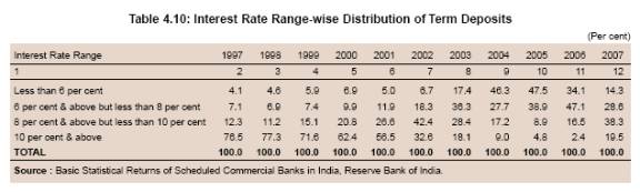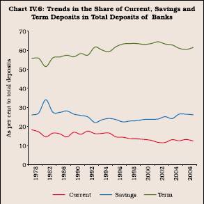 4.37 On the whole, the share of term deposits increased from 59.2 per cent at end-March 1995 to 63.1 per cent at end-March 2000 and further to a peak of 64.4 per cent at end-March 2002. The share of savings deposits declined from 24.2 per cent at end-March 1995 to 23.7 per cent at end-March 2000. Subsequently, the share of saving deposits increased to around 26.1 per cent by end-March 2007, while that of term deposits declined to 61.5 per cent (Chart IV.6).