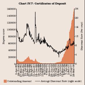 4.40 Apart from tax benefits on long term deposits, the introduction of bank deposit schemes for senior citizens at higher interest rates also led to improved mobilisation of time deposits by banks. The lowering of the minimum maturity period of certificates of deposit (CDs) to 7 days in April 2005 also generated increased interest in CDs. CDs, introduced in June 1989, are essentially securitised short-term time deposits, which provide greater flexibility to investors for deploying their short-term surplus funds. They are issued by banks during periods of tight liquidity at relatively higher discount rates as compared with term deposit rates. Notwithstanding deregulation of interest rates on CDs in 1992 and reduction in minimum issue size to Rs.1 lakh and requirement of issuance only in dematerialised form in 2002, there was hardly any activity in this market segment up to 2004, except the years of credit pick-up during the mid-1990s. With sustained pick-up in bank credit growth at around 30 per cent from 2004-05, banks increasingly resorted to the issuance of CDs to supplement their deposit mobilisation in order to support the strong credit demand. The flexibility of return that can be offered by the cash-strapped banks to attract bulk deposits made CDs the preferred route for mobilising resources, especially by private and foreign banks with limited branch network and retail customer base. Accordingly, the outstanding amount of CDs issued by banks increased from Rs.12,078 crore at end-March 2005 to Rs.93,272 crore by end-March 2007 and further to Rs.1,47,792 crore as on March 28, 2008. Accordingly, the share of outstanding CDs in aggregate deposits of SCBs increased from less than 1 per cent in 2004-05 to 4.6 per cent during 2007-08. The average discount rate on CDs, which had hardened from 5.3 per cent at end-March 2005 to 11.1 per cent at end-March 2007 in line with the general hardening of interest rates, eased somewhat thereafter (Chart IV.7).