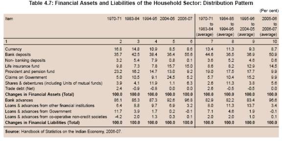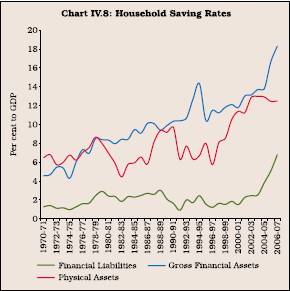 4.44 Bank deposits constitute the single largest source of domestic savings. Despite some fluctuations from time to time, bank deposits have maintained their predominant position in domestic savings and have played an important role in stepping up the share of financial savings of the household sector in gross domestic savings from an average of 1.9 per cent in the 1950s to 10.8 per cent during 2000-2007. The household sector has increasingly incurred financial liabilities, par ticularly through bank advances, to undertake its investments in physical assets in the form of construction, machinery and equipment, and change in stocks in recent years, which tended to dampen the net household financial savings. It is, however, significant to note that physical savings of the household sector have also moved in tandem with the increase in gross financial savings (Table 4.18 and Chart IV.8). Although a part of savings in physical assets is for genuine requirements, quite a significant part is locked up in unproductive assets.