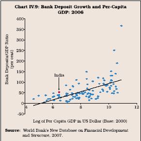 4.45 Although the bank deposits to GDP ratio (deflated by consumer price index) in India moved up gradually over the years, it was still lower than almost all advanced countries and several emerging market economies in Asia included in the sample (Table 4.19). This was despite the fact that some of the advanced countries are predominantly market-based systems. An analysis of 116 countries covering both developed and developing economies reveals that the bank deposits to GDP ratio, in general, tends to move up as income levels rise (Chart IV.9).