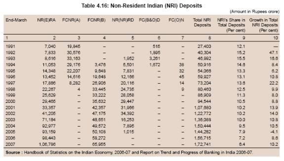 4.41 In this phase, the growth of non-resident (NRI) deposits decelerated significantly. As a result, the share of NRI deposits in aggregate deposits of SCBs, which constituted 15.5 per cent at end-March 1993,declined consistently (except in 1997) to 9.5 per cent at end-March 2004 and further to 6.4 per cent at end-March 2007 (Table 4.16). As a result, the share of foreign deposits in total deposits declined significantly (refer Table 4.13). The sharp decline witnessed beginning 2003-04 could be attributed to the rationalisation of various NRI deposit schemes and decline in the ceiling interest rates prescribed by the Reserve Bank for various deposit schemes as part of the strategy to manage capital flows as well as increased recourse to foreign currency borrowings by banks in view of lower interest rates abroad. The present ceilings in respect of FCNR(B) deposits of all maturities is LIBOR/SWAP rate minus 75 basis points and for NR(E)RA deposits is at the LIBOR/ SWAP rate effective from April 24, 2007. NRI deposit schemes were introduced in the 1970s and in the 1990s to support balance of payments (Box IV.3).