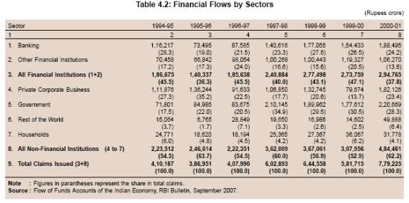 4.15 The relative significance of financial claims by the various sectors show year to year variations. The financial intermediation process has been dominated by the banking system. The share of claims by all financial institutions in total claims moved in the range of 36.3 per cent and 47.1 per cent; it averaged 42.2 per cent during the period 1994-95 to 2000-01. Financial flows through the banking sector increased from Rs.1,16,217 crore in 1994-95 to Rs.1,88,495 crore in 2000-01 with the share of financial flows through the banks in the flows through the financial intermediary sector, on the whole, increasing from around 62 per cent in 1994-95 to around 64 per cent in 2000-01. The share of the banking sector in total claims declined from 28.3 per cent to 24.2 per cent, while that of the OFIs declined from 17.2 per cent to 13.6 per cent during this period (Table 4.2). The share of non-financial institutions, led by the Government and to an extent by the private corporate sector, increased over this period.