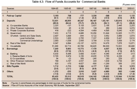 4.16 The various sources of funds for the banks, as reflected in the flow of funds accounts of the Indian economy, showed large fluctuations. A notable feature, however, was that the deposits continued to constitute the largest source of funds for the banks. The share of deposits in total sources for the commercial banks increased steadily from 85 per cent in 1994-95 to around 97 per cent in 2000-01. The shares of paid-up capital and borrowings declined sharply between 1994-95 and 2000-01 (Table 4.3). While deposits were mobilised primarily from households, the share of the corporate sector in bank deposits increased. The share of households in total commercial bank deposits remained around 70 per cent over the period 1994-95 to 2000-01, while that of the private corporate sector increased from 0.6 per cent to 3.8 per cent. The share of rest of world rose from 8.3 per cent to 11.3 per cent. On the other hand, the share of financial institutions in commercial bank deposits declined from 6.9 per cent to 2.7 per cent during the same period. Bank deposits from the government sector include deposits held by the local authorities and public sector commercial undertakings apart from the Central and State Governments. A notable feature was the increase in the holdings of deposits by the local authorities with banks. Borrowings, as a source of funds for the commercial banks, were driven by the borrowings from the Reserve Bank, other financial institutions and from the rest of the world sector. The rationalisation of the refinance facilities from the Reserve Bank, whereby refinance facilities other than export credit refinance facility was withdrawn, led to lower recourse of borrowings by banks from the Reserve Bank. Financial institutions constituted the main source of funds in the form of borrowings for banks, followed by the rest of the world sector in 2000-01.