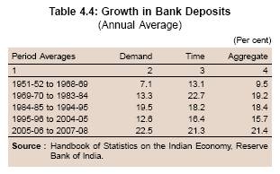 4.50 To sum up, banks in India have played an important role in financial intermediation by mobilising deposits from the public, and stepping up the savings rate. Growth of bank deposits has varied over different periods of time and has been accompanied by some distinct features in each phase. In the phase beginning immediately after nationalisation of banks, bank deposit growth accelerated sharply as rapid branch expansion that followed nationalisation enabled banks to tap savings from the rural areas. In the second phase (1984-1995), bank deposit growth decelerated as banks faced increased competition from alternative saving instruments, especially capital market instruments (shares/debentures/units of mutual funds) and non-banking financial companies. This was the phase of disintermediation as savings instead of being deployed in bank deposits were increasingly deployed in alternative saving instruments. Bank deposit growth decelerated further between 1995 and 2004. In this phase, banks faced competition from post office deposits, which carried significantly higher tax-adjusted returns than bank deposits. Despite this, however, bank deposits maintained their share in the savings of the household sector. During this phase, both ownership pattern and maturity pattern underwent a significant change. Bank deposits held by the Government and corporate sectors increased significantly. As a result, the share of deposits held by the household sector declined significantly even as the share of banks deposits in household sector financial savings remained broadly unchanged. The share of term deposits in total deposits increased. This was largely on account of increase in the share of the Government and the corporate sectors, as the share of the household sector in term deposits declined. However, within term deposits, there was a significant shortening of maturity profile in favour of short-term deposits.