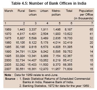 4.19 In the first phase, the aggregate deposit growth of SCBs increased sharply averaging 19.2 per cent during 1969-1984 as compared with 9.5 per cent during the pre-nationalisation phase (1951-1969). Net financial savings (net of financial liabilities) of the household sector increased sharply by 49.2 per cent in a single year in 1970-71, i.e., immediately after banks were nationalised. Consequently, physical savings of households declined by 8.9 per cent in 1970-71. Large branch expansion by commercial banks, especially in rural and semi-urban areas following nationalisation of 14 major private sector banks in 1969 also had a significant positive impact on deposit growth of banks. The second round of nationalisation of six private sector banks in 1980 led to further expansion of branch network and helped spur the growth of deposits. The number of bank offices in rural and semi-urban areas increased from 1,443 and 3,337, respectively, in 1969 to 30,185 and 9,816, respectively, in 1985. Consequent to the large branch expansion, outreach of the banking system expanded as reflected in the population per office, which declined from 65,000 in 1969 to around 14,000 in 1985 and has remained broadly stable thereafter (Table 4.5).