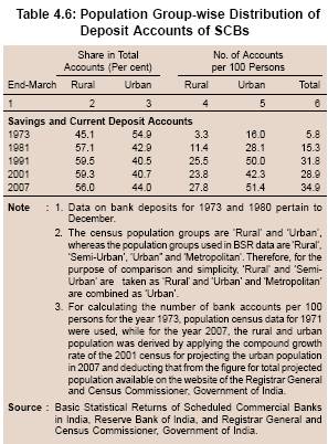 4.21 Increased access to banking facilities helped improve the banking penetration. At the all-India level, the number of savings and current deposit accounts with SCBs per hundred persons increased from 5.8 in 1973 to 15.3 in 1981 and further to 31.8 in 1991. It declined to 28.9 in 2001 before increasing again to 34.9 in 2007. In rural areas, the number of savings and current deposit accounts with SCBs per hundred persons increased from 3.3 in 1973 to 11.4 in 1981 and further to 25.5 in 1991. It declined to 23.8 in 2001 before increasing again to 27.8 in 2007 in line with the emphasis on financial inclusion by the Government and the Reserve Bank. The share of deposits in rural areas in banks’ total savings and current deposit accounts, which had increased up to 1991, however, declined in recent years (Table 4.6). In this context, it may be noted that apart from the SCBs, deposit facilities are also provided by primary agricultural credit societies (PACS), urban co-operative banks (UCBs) and post offices and, therefore, they also need to be taken into account in assessing the penetration of financial services in India (see Chapter VII for details).