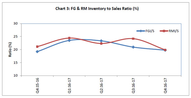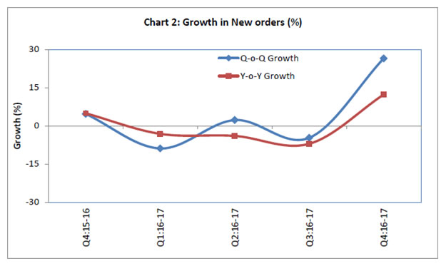 Today, the Reserve Bank released results of the 37th round of the Order Books, Inventories and Capacity Utilisation Survey (OBICUS) conducted in April-June 2017 for the quarter January-March 2017. The survey provides a snapshot of demand conditions facing the Indian manufacturing sector1. Responses were received from 724 companies in this round of the survey. Highlights: 1) Capacity Utilisation (CU): At the aggregate level, CU rose in a seasonal pick-up and stood at 74.1 per cent in Q4:2016-17, co-moving with the de-trended index of industrial production2 (IIP) for manufacturing sector (Chart 1). Seasonally adjusted CU declined marginally in Q4:2016-17. 2) Order Books: New orders recorded a substantial growth in Q4:2016-17 on both, quarter-on-quarter and year-on-year bases (Chart 2). 3) Finished Goods Inventory to Sales Ratio: The finished goods inventory to sales ratio (FGI/S) declined sequentially due to higher growth in sales; the ratio, however, stood at a slightly higher level on a year-on-year basis. 4) Raw Material Inventory to Sales Ratio: The raw material inventory to sales ratio (RMI/S) dipped significantly in Q4:2016-17 from the previous quarter’s level (Chart 3). ANNEX