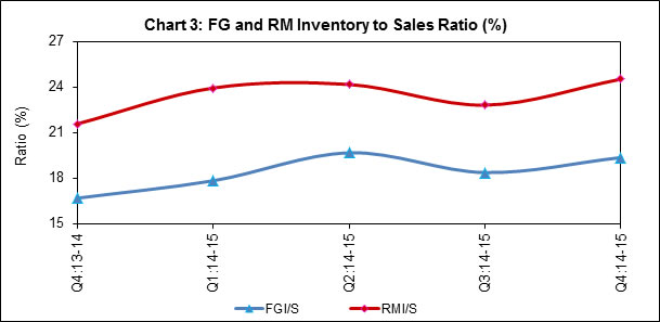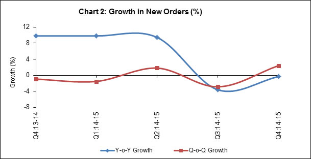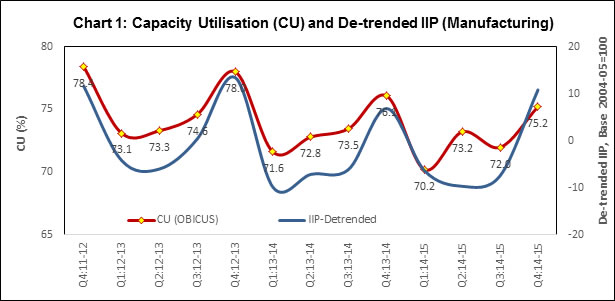 The Order Books, Inventories and Capacity Utilisation Survey (OBICUS) captures actual data from the companies in the manufacturing sector. This round of OBICUS, which is the 29th round in the series, captures data for Q4:2014-15. In all, 1,273 common (for last five quarters) manufacturing companies (Government: 48, Public: 871 and Private: 354) responded in this round of survey. The analysis is based on the data on order books, inventory levels for raw materials & finished goods, and capacity utilisation, received from these common set of companies. Highlights: Capacity Utilisation (CU): At the aggregate level, CU recorded seasonal increase in Q4:2014-15 and stood at 75.2 per cent, below its level during the same quarter of the previous year. There is broad co-movement between capacity utilisation and de-trended IIP manufacturing (Chart 1). Order Books: The new orders growth bounced back to positive territory on a q-o-q basis. On a y-o-y basis, new orders recorded a marginal contraction in Q4:2014-15 (Chart 2). Inventory to Sales Ratio: The finished goods inventory to sales ratio (FGI/S) rose marginally in Q4:2014-15 from the previous quarter and also stood at a higher level as compared to the position in Q4:2013-14. The raw material inventory to sales ratio (RMI/S) witnessed similar movement (Chart 3). ANNEX