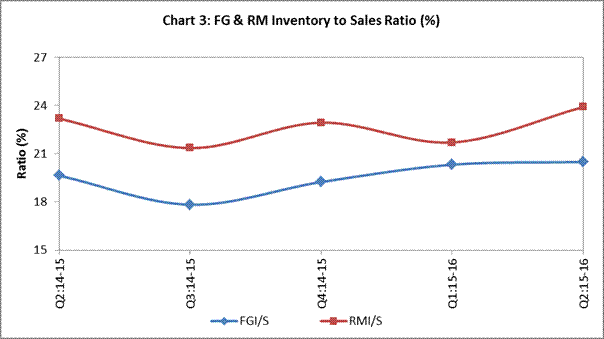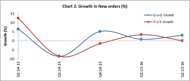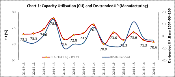 The Order Books, Inventories and Capacity Utilisation Survey (OBICUS) captures actual data from the companies in the manufacturing sector. This round of OBICUS, which is the 31st round in the series, captures data for Q2:2015-16. In all, 1,104 manufacturing sector companies responded in this round of the survey. The analysis is based on the data on order books, inventory levels for raw materials & finished goods, and capacity utilisation, received from a common set of companies. Highlights: Capacity Utilisation (CU): At the aggregate level, CU recorded fractional decline in Q2:2015-16 over the previous quarter and stood at 70.6 per cent; it was also lower than the level during the same quarter of the previous year. There is broad co-movement between capacity utilisation and de-trended IIP manufacturing (Chart 1). Order Books: The average new orders grew marginally in Q2:2015-16 from its level of previous quarter. However, it remained unchanged from its level a year ago (Chart 2). Inventory to Sales Ratio: The finished goods inventory to sales ratio (FGI/S) remained steady in Q2:2015-16. The raw material inventory to sales ratio (RMI/S) increased in Q2:2015-16 and stood at a higher level as compared to the level observed in Q2:2014-15 (Chart 3). Sangeeta Das Press Release : 2015-2016/1773 ANNEX