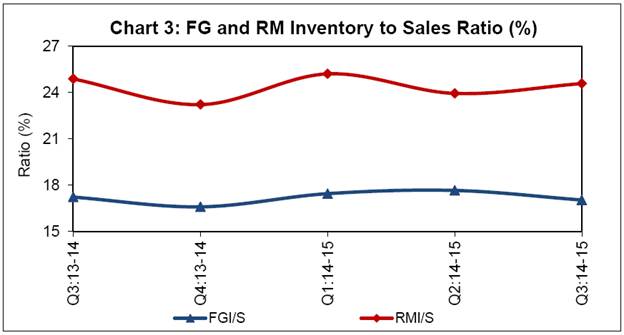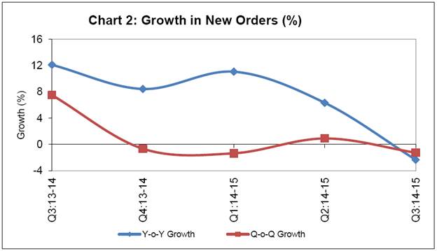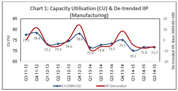 The Order Books, Inventories and Capacity Utilisation Survey (OBICUS) captures actual data from the companies in the manufacturing sector. The current round of OBICUS, which is the 28th round in the series, captures data for Q3:2014-15. In all, 1,297 common (for last five quarters) manufacturing companies (Government: 49, Public: 903 and Private: 345) responded in this round of survey. The analysis is based on the data on order books, inventory levels for raw materials & finished goods, and capacity utilisation, received from these common set of companies. Highlights: Capacity Utilisation (CU): There is broad co-movement between capacity utilisation and de-trended IIP manufacturing (Chart 1). CU at the aggregate level, remained at the same level in Q3:2014-15 as that of the previous quarter. However, it stood at a lower level from that in same quarter of the previous year (Table 1). Order Books: The new orders growth showed a decline and became negative in Q3:2014-15 both on a year-on-year and quarter-on-quarter basis (Chart 2). Inventory to Sales Ratio: The finished goods inventory to sales ratio declined to 17 per cent in Q3:2014-15. The raw material inventory to sales ratio increased in Q3:2014-15 as compared to the previous quarter. Both, raw material inventory to sales ratio (RMI/S) and finished goods inventory to sales ratio (FGI/S), remained more or less at the same level as that of same quarter of previous year (Chart 3). ANNEX