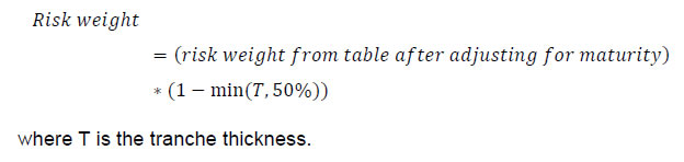 108. Specifically, for exposures with long-term ratings, risk weights will be determined according to the following table and will be adjusted for tranche maturity and tranche thickness for non-senior tranches as prescribed in clause 109 of these directions.