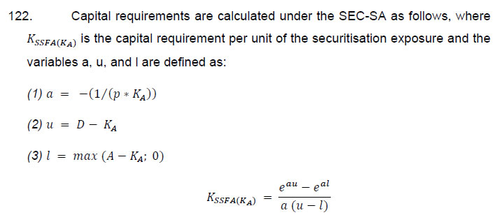 114. The resulting risk weight is subject to a floor risk weight of 10% for senior tranches, and 15% for non-senior tranches. I. Securitisation – Standardised Approach (SEC-SA) 115. To calculate capital requirements for a securitisation exposure to a standardised approach (SA) pool using the securitisation standardised approach (SEC-SA), a bank would use a supervisory formula and the following bank-supplied inputs: the SA capital charge had the underlying exposures not been securitised (KSA); the ratio of delinquent underlying exposures to total underlying exposures in the securitisation pool (W); the tranche attachment point (A); and the tranche detachment point (D). 116. KSA is defined as the weighted-average capital charge of the entire portfolio of underlying exposures, calculated using the risk-weighted asset amounts in Paragraph 5 of the “Master Circular – Basel III Capital Regulations” dated July 1, 2015 in relation to the sum of the exposure amounts of underlying exposures, multiplied by 9%. This calculation should reflect the effects of any credit risk mitigant that is applied to the underlying exposures (either individually or to the entire pool), and hence benefits all of the securitisation exposures. KSA is expressed as a decimal between zero and one (that is, a weighted-average risk weight of 100% means that KSA would equal 0.09). 117. In cases where a bank has set aside a specific provision or has a non-refundable purchase price discount on an exposure in the pool, KSA must be calculated using the gross amount of the exposure without the specific provision and/or non-refundable purchase price discount. 118. The variable W equals the ratio of the sum of the nominal amount of delinquent underlying exposures to the nominal amount of underlying exposures. Delinquent underlying exposures are underlying exposures that are 90 days or more past due, subject to bankruptcy or insolvency proceedings, in the process of foreclosure, held as real estate owned, or in default, where default is defined within the securitisation deal documents. 119. The inputs KSA and W are used as inputs to calculate KA, as follows: ![]() 120. In case a lender does not know the delinquency status, as defined above, for no more than 5% of underlying exposures in the pool, the lender may still use the SEC-SA by adjusting its calculation of KA as follows: ![]() 121. If the lender does not know the delinquency status for more than 5%, the securitisation exposure must be risk weighted at 1250%. ![]() 123. The supervisory parameter p in the context of the SEC-SA is set equal to one. 124. The risk weight assigned to a securitisation exposure when applying the SEC-SA would be calculated as follows: