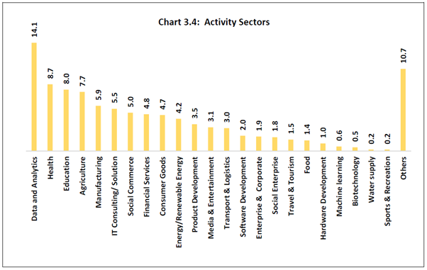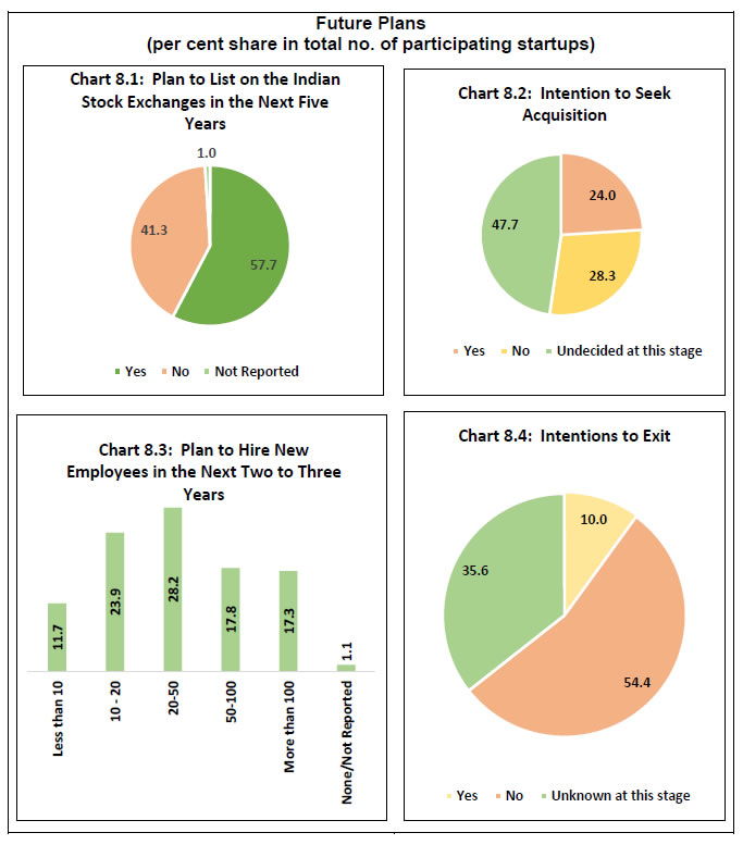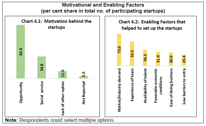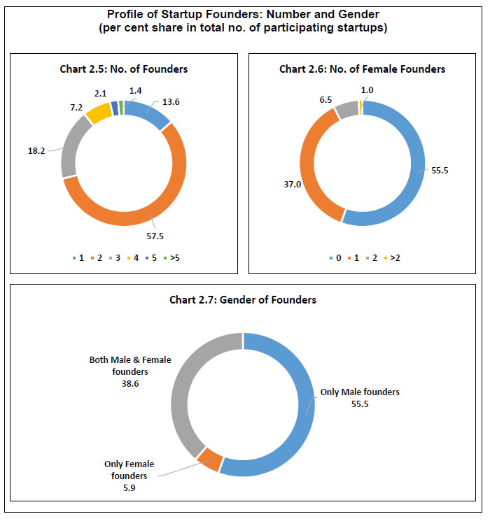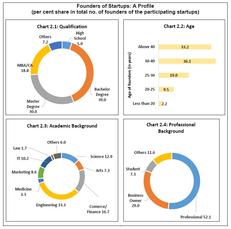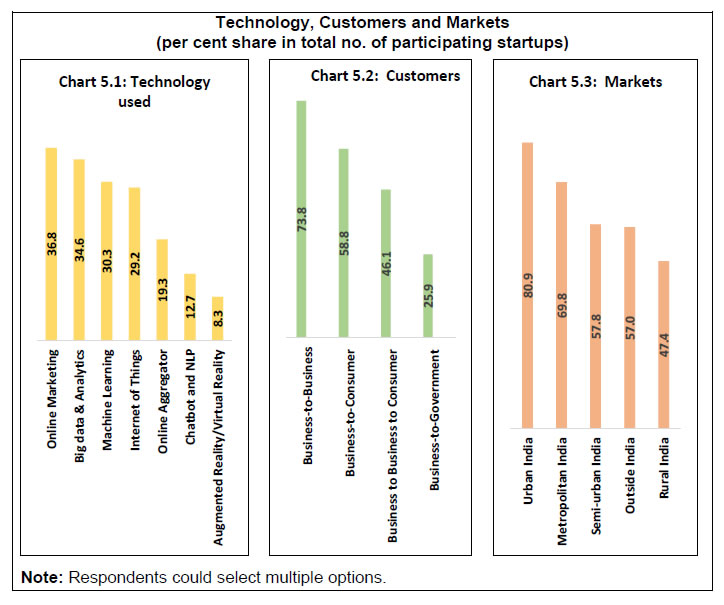 Findings from a pilot survey on Indian startup sector conducted by the Reserve Bank are presented in this document. It presents the feedback received from the survey respondents and does not reflect the views of the Bank. Comments/suggestions are solicited from stakeholders on the findings of the survey as well as on methodology, usefulness of information and scope for improvement in the survey. The same may be forwarded to - The Director, E-Commerce and New Age Survey Division, Department of Statistics and Information Management, Reserve Bank of India, C-8, 2nd floor, Bandra-Kurla Complex, Bandra (East), Mumbai-400051; e-mail. 1.The Reserve Bank conducted a pilot survey on Indian startup sector during November 2018 to April 2019. A total of 1,246 startups (public/private limited companies, partnership firms, limited liabilities partnerships and others) participated in the survey. Around three-fourths of respondents were from the states of Karnataka, Maharashtra, Telangana, Delhi and Tamil Nadu. 2.Startups in six sectors, viz., agriculture, data & analytics, education, health, IT consulting/solution and manufacturing accounted for nearly 50 per cent of the survey respondents. 3.Respondents cited market/industry demand and team experience as the major enabling factors for setting up the startups. Both domestic markets (mainly semi-urban, urban and metropolitan areas in India) and foreign countries were the target destination of the startups. 4.Almost half of the respondents informed that they were in an early stage of revenue generation while 31 per cent were in a growing stage. Of the remaining startups which were yet to generate any revenue, as high as 86 per cent were aged below three years. 5.The annual turnover for over one-fourths of the respondents was up to ₹ 10 lakhs whereas around 20 per cent startups did not report any revenue generation. Less than one-fifths of the respondents reported that their turnover exceeded ₹ 1 crore. 6.Only 14 per cent of startups had more than 10 employees in the first six months of their operation but as the sector matured, the share increased to 40 per cent at the time of conducting the survey. 7. Around 36 per cent of the startups availed institutional loans (including from banks) to finance their activities. Pilot Survey on Indian Startup Sector - Major Findings 1.1 In view of the emerging importance of the startup sector in the Indian economy, the Reserve Bank of India (RBI) conducted a pilot survey on Indian startup sector during November 2018 to April 2019. Responses were received from 1,246 startups. This report presents the major findings of the survey. 1.2 The structure of the report is as follows: section 2 presents the objectives of the survey while the survey coverage and design are briefly described in section 3. Major findings from the survey are discussed in section 4 and the conclusions are summarised in section 5. 2.1 Startups are ignited by entrepreneurial and innovative spirit in an economy and play an important role in its growth. The pilot survey was aimed at collecting information on select important characteristics of the startup sector, viz., geographical, institutional and age profile of the sector, academic, professional and gender profile of the founders, motivational factors, turnover, workforce, target markets, types of products, technology used, sources of funds and future plans (the survey questionnaire is provided in the Annex). 3.1 The pilot survey approached the following target groups: (a) startup entities recognised by the Department for Promotion of Industry and Internal Trade (DPIIT) of the Ministry of Commerce and Industry, Government of India; and (b) entities under incubators/accelerators1 with age not more than seven years2, which might be outside the DPIIT list and could also participate in the survey by downloading the survey questionnaire from RBI website. Keeping in view the objectives, the pilot survey collected information on certain important aspects such as profiles of the startups and their founders, nature of products, sources of funds and future plans. Salient observations on these aspects are presented below. 4.1 Startup Sector in India: The Contours The summary profile of the survey respondents is presented below. 4.1.1 Nearly three-fourths of the participants were from the states of Karnataka, Maharashtra, Telangana, Delhi and Tamil Nadu, indicating large concentration of the startup sector in India in a few states (Chart 1.1). 4.1.2 Private efforts spearhead the startup sector in India: nearly 86 per cent of the participating startups were private limited companies (Chart 1.2). 4.1.3 Over 70 per cent of the participating startups were set up in the last three years (i.e., in the period from 2016-17 to 2018-19) (Chart 1.3). ![]() Founders of the startup sector are business initiators and the entrepreneurs, and a gist of their profile is given below. 4.2.1 Nearly 88 per cent of the founders had academic qualification of at least a bachelor’s degree (Chart 2.1). Over 10 per cent of the founders were below 25 years of age and another 55 per cent were in the age group 25 to 40 years (Chart 2.2). 4.2.2 One third of the founders had academic background in engineering (Chart 2.3). A majority of the founders had professional experience and 7.3 per cent of the founders were still students (Chart 2.4). ![]() 4.2.3 Most of the startups had at least two co-founders (Chart 2.5). Nearly 45 per cent of the participating startups had at least one female founder (Chart 2.6). In all, 5.9 per cent of the participating startups were founded by only females in comparison to 55.5 per cent by only male founders. The remaining 38.6 per cent of the participating startups had both male and female as co-founders (Chart 2.7). ![]() 4.3 Product Innovation and Sectoral Spread Product innovation often drive startups, who develop entrepreneurship, propel productivity gains and create employment opportunities across econo