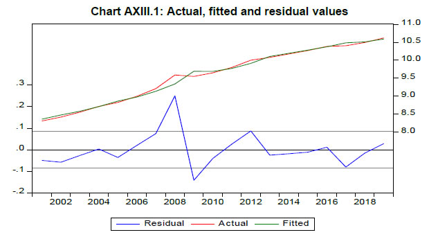 The lag length of AR model was chosen based on the residual diagnostics, which indicate that two lags are optimal. In particular, the Breusch-Godfrey serial correlation LM test was done to test the null hypothesis, H0: No serial correlation of residuals upto 2 lags. The test results (Table AXIII.2) yielded a p-value of 0.545 (higher than 0.05), by which there is no reason to reject the null hypothesis, showing that there is no serial correlation left in the residuals. Further, the Correlogram Q-Statistics also confirm this. ![]() Forecast efficiency: To examine forecast efficiency, the model was worked out based on data from 2000-01 to 2015-16 for out-of-sample forecast which was used to forecast values for 3 years from 2016-17 to 2018-19. The measures of out-of-sample forecasts are given below. The root mean square error (RMSE) for the out-of-sample forecasts is 0.075, which is quite low and closer to the RMSE for in-sample forecast efficiency, 0.078. ![]() (5) Projection of Net Income Net Income is projected using net income-to- balance sheet ratio for the period 2000-01 to 2018-19 and the projected values of balance sheet as provided in table AXIII.4.
