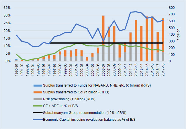 4.3 The Thorat Committee (2004) recommendations were not accepted by the RBI. 4.4 A historical perspective (1990–91 to 2017–18) of the movement in the economic capital of the RBI (Box 4.1) was also considered. 4.5 Some of the key takeaways from the analysis presented in Box 4.1 are: