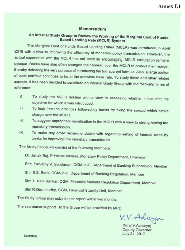 I.7 The spread, as measured by the difference between the lending rate and the 1-year MCLR, which was expected to be by and large stable, has shown large variations from month to month, from bank to bank and from sector to sector. While some variability in the spread over the MCLR was expected, large variations in the spreads are difficult to explain. Accordingly, an internal Study Group was constituted to study the various aspects of the MCLR system and explore linking of bank lending rates directly to market- determined benchmarks. The announcement of the Constitution of the Study Group was made in the Statement on Developmental and Regulatory Policy of the Reserve Bank on August 2, 2017. The Study Group comprised the following officials:
