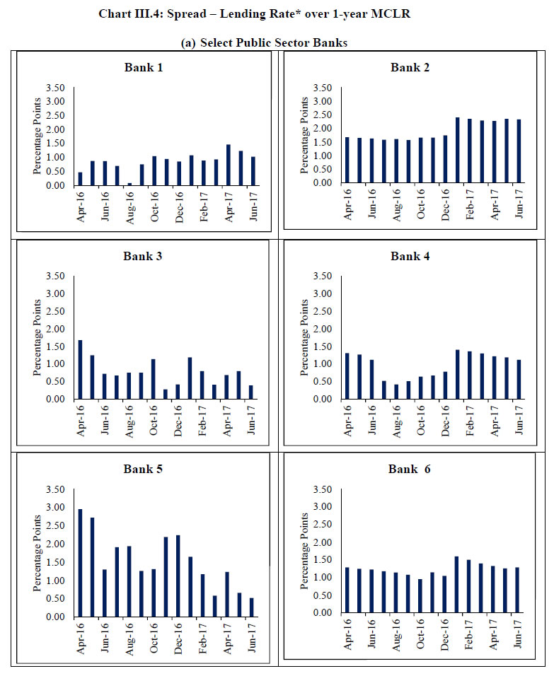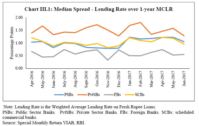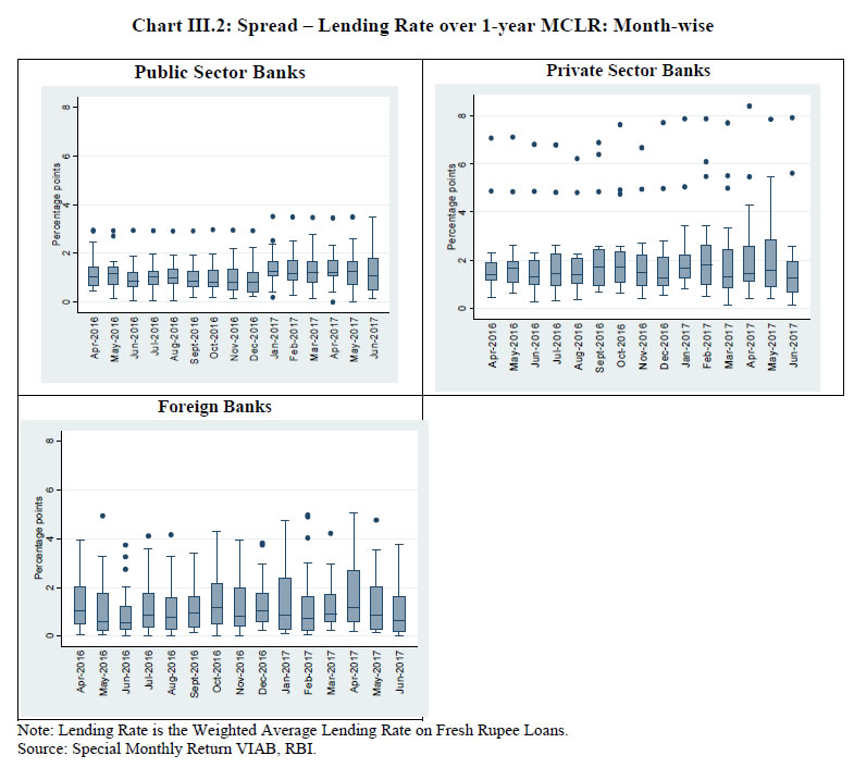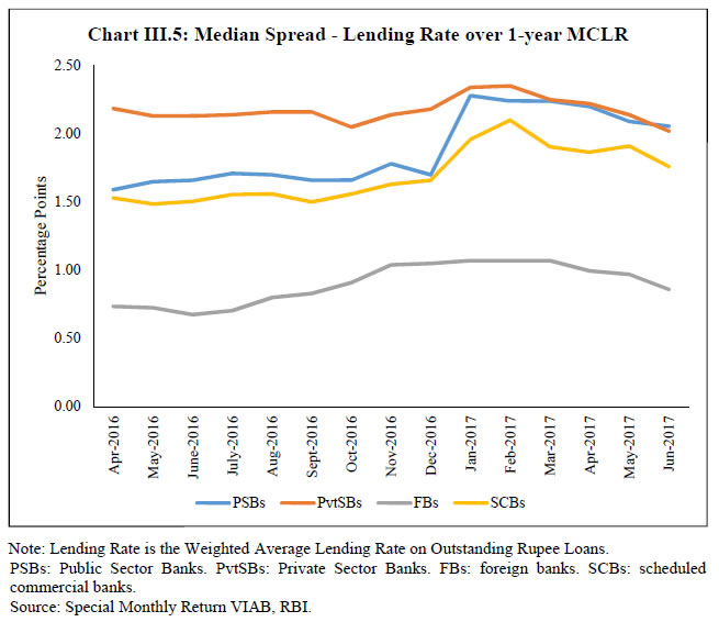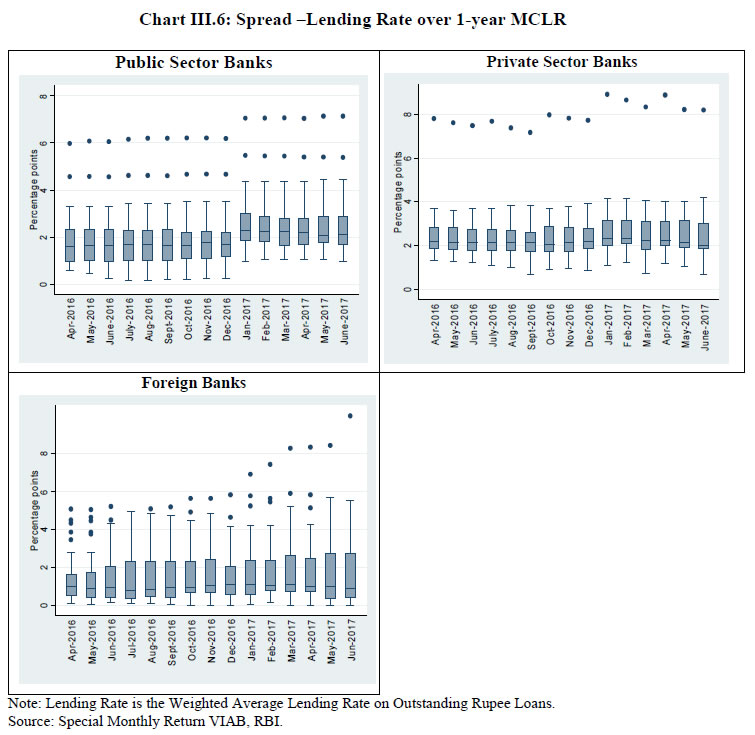 5. Median spreads charged over the MCLR by all bank groups remained broadly stable in the case of fresh rupee loans from April 2016 to December 2016. However, median spreads charged rose sharply in January 2017. Median spreads of public and private sector banks declined by June 2017. However, while the median spread of private sector banks declined to the pre-January 2017 level, the median spread of public sector banks remained significantly above the pre-January 2017 level.