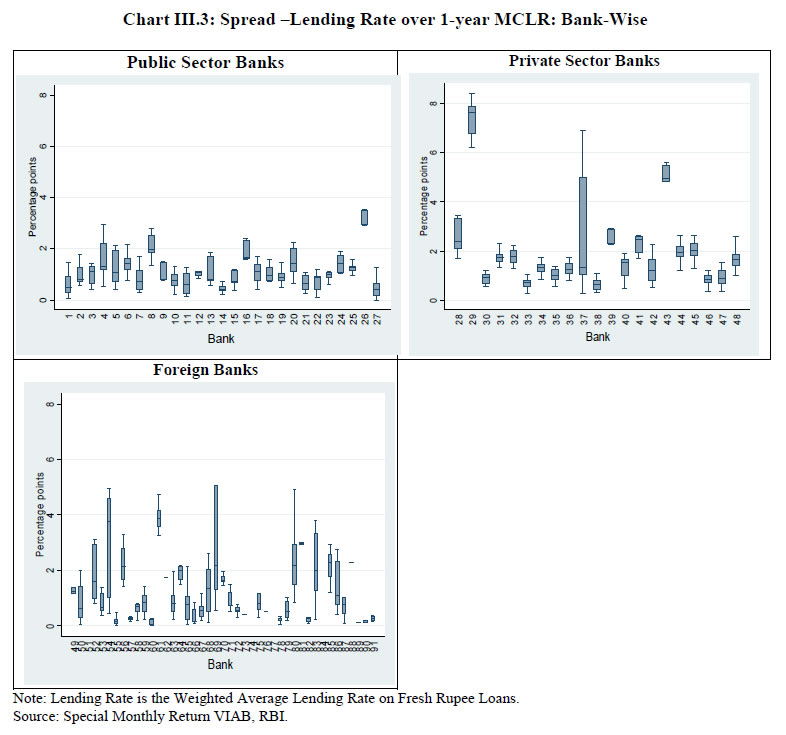 9. Being an internal benchmark, the MCLR is expected to vary across banks. The spread over the MCLR could also vary from bank to bank due to idiosyncratic factors. However, variations in the spreads across banks appear too large to be explained based on bank- level business strategy and borrower-level credit risk. In particular, spreads charged by some banks seem excessively and consistently large. The analysis suggests that the spreads were mostly changed arbitrarily by banks for similar quality borrowers. While the spread over the MCLR was expected to play only a small role in determining the lending rates by banks, it turned out to be the key element in deciding the overall lending rates. This has made the entire process of setting lending interest rates by banks opaque and impeded the monetary transmission.
