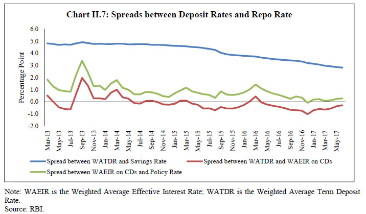 4. Overall, monetary transmission has been impeded by four main factors: (i) maturity mismatch and interest rate risk in the fixed rate deposits but floating rate loan profile of banks; (ii) rigidity in saving deposit interest rates; (iii) competition from other financial saving instruments; and (iv) deterioration in the health of the banking sector. A major factor that impeded transmission was the maturity profile of bank deposits. Deposits with maturity of one year and above constituted 53 per cent of banks’ total deposits at end- March 2016, most of which were at fixed rates of interest. Another source of weak transmission was rigidity in interest rates on banks’ saving deposits, which remained notoriously stubborn even as the policy repo rate and interest rates on term deposits moved in either direction. The third factor, which hindered monetary transmission was the competition that banks faced from other saving instruments. It appears that banks were reluctant to reduce interest rates sharply for fear of losing deposits to other financial saving instruments such as mutual funds and small saving schemes. Although bank deposits have some distinct advantages in the form of stable returns (vis-à-vis mutual fund schemes) and liquidity (vis-à-vis small saving schemes), bank deposits are in a disadvantageous position in terms of tax-adjusted returns in comparison with these schemes. Banks, therefore, often appeared to be reluctant to reduce interest rates on deposits in line with the reduction in the policy rate by the Reserve Bank. These factors imparted rigidity to the liability side of banks’ balance sheet. Finally, empirical analysis suggests that the extent of responsiveness of interest earnings and interest expenses to the changes in the policy repo rate is broadly the same, making the net interest margins (NIMs) impervious to monetary policy changes. The deterioration in the health of the banking sector and the expected loan losses in credit portfolios induced large variability in spreads in pricing of assets, severely impacting monetary transmission as banks’ NIMs have remained broadly unchanged in the face of large stressed assets. Thus, rigidities on the liability side such as longer-term maturity pattern of deposits with fixed interest rates, along with the expected loan losses on the asset side, have been reflected in higher pricing on the asset side, i.e., lending rates.