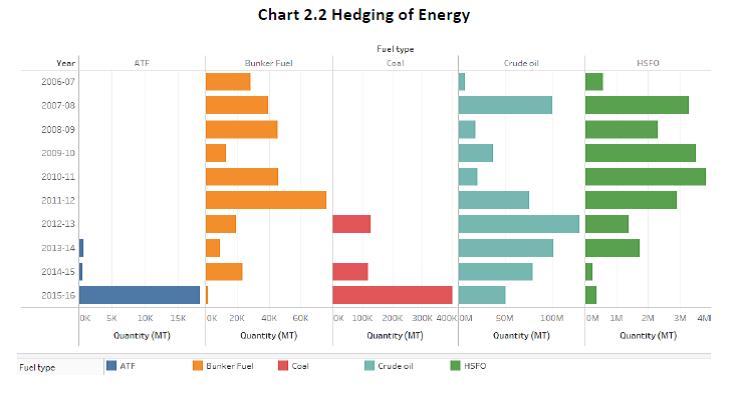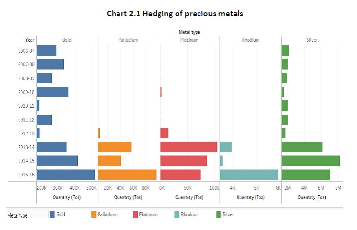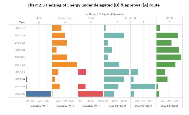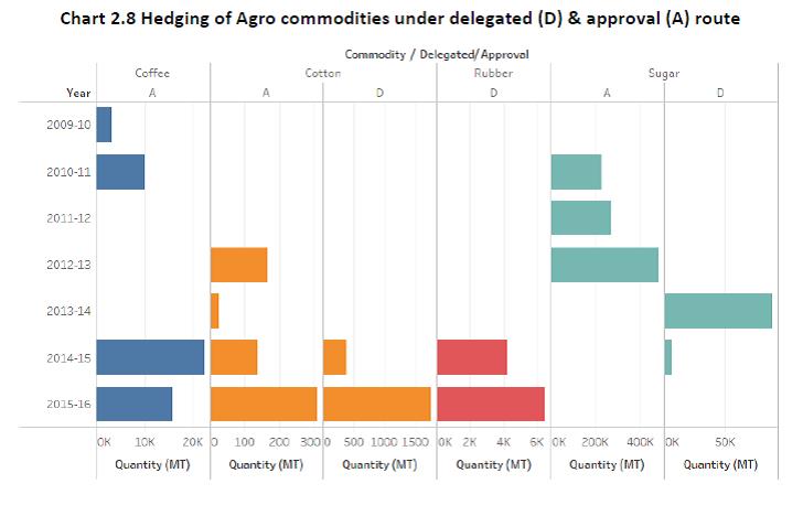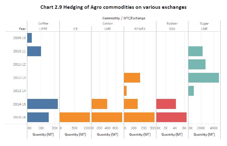 1.11 The Working Group held three meetings between October 14, 2016 and February 27, 2017. During its deliberations, the Group had the benefit of interacting with external experts from the corporate sector, commercial banks and advisory firms. The Group would like to acknowledge the valuable contributions of Shri Anil Mathews and Shri Vikram Sondhi of Hindalco, Shri Johnson Lewis and Shri Manish Goyal of Bank of Nova Scotia. The Group would like to particularly acknowledge the contribution of Shri Muzammil Patel of Deloitte Touche Tohmatsu India LLP for sharing his considerable expertise. The Group would also like to acknowledge the valuable support and assistance extended by the officers of the Financial Markets Regulation Department viz., Shri Nitin Daukia, Shri Deepak Kundu and Smt. Zenobia Kargutkar. 1.12 The structure of this report is as follows. Chapter 2 reviews the commodity price risk hedging activity in all its dimensions. Chapter 3 lays down a model regulatory framework for identification of commodity price risks arising from variable input and output prices taking in to account the Indian commodity profile and state of development and sophistication of domestic markets and participants, respectively. Chapter 4 describes various regulatory issues in the context of commodity price risk management that were examined by the Working Group and makes related recommendations. These include hedging of risks arising out of domestic trade in commodities versus cross-border trade, approach for identifying commodities for hedging price risk, listing as an eligibility criteria for access to hedging markets overseas, inventory hedging, use OTC versus exchange traded products, currency risk arising out of hedging commodity price risk and role of domestic stock exchanges in offering commodity derivatives. Chapter 5 examines the potential role of commercial banks in both encouraging their constituents to hedge their commodity price risk and ultimately to act as market-makers. Chapter 6 summarizes the recommendations of the Working Group. The annexure to the report provides an overview of select domestic commodity exchanges and their products. Chapter 2 2.1 As briefly explained in Chapter 1, the Gupta Committee stressed the need for existence of genuine underlying risk to preempt speculative use of overseas derivative markets. It recognized the need for access to both exchange markets and OTC markets but required that OTC markets must necessarily have some depth, liquidity, transparency and equitable access. Based on the sample data collected from Authorized Dealer banks active in facilitating commodity derivative transactions of residents in the overseas markets, the following broad picture emerges. 2.2 Most hedging activity is in base metals but a reasonably wide variety of products are hedged offshore by Indian corporates. (Table 2.1). 2.3 Table 2.2 provides a snapshot of hedging activities in these commodities2. For energy and precious metals, hedging is entirely in OTC segment. Iron ore (100%) and lead (75%) are the two metals with large OTC hedging. For all other metals as well as agricultural products, hedging is done on established exchanges. Within exchanges, apart from LIFFE (coffee), NYMEX and ICE (Cotton) and SGX (rubber), all hedging is in the London Metal Exchange (LME). 2.4 Hedging is almost entirely under the approval route in energy and precious metal products. Base metal hedging is largely under the delegated route while for agricultural products, hedging is mainly under the approval route for coffee and sugar while it is under the delegated route for cotton and rubber. 2.5 Most hedging interest is for exposure of commodity risk in international trade of importers/exporters. Virtually all hedging is by importers/exporters for agricultural goods and energy products. Significant hedging interest by domestic users (producers and consumers) is visible in both precious metals as well as base metals. A more detailed presentation of category-wise hedging behavior is presented below. Precious metals 2.6 As can be seen in Chart 2.1 below, Gold and silver constituted the majority by volume of the precious metals hedged. All such hedges were booked on the OTC market and under the approval route. Hedging volumes in all precious metals has seen a significant pickup since 2013-14. Energy 2.7 Amongst energy products, crude oil emerges as the commodity against which the maximum hedges have been booked followed by High Sulphur Fuel Oil (HSFO) (Chart 2.2). A majority of such hedges have been booked under the approval route (Chart 2.3) and all hedges have been booked through the OTC route. Metals 2.8 Aluminum, followed by Copper and Tin were the most hedged commodities in the metals basket (Chart 2.4). Most of the hedging was under the delegated route (Chart 2.5). Hedging activity was predominantly on exchanges except for lead (Chart 2.6) Agro commodities 2.9 Sugar dominated the list of agro-commodities hedged till 2012-13. For the last 2 years coffee, rubber and sugar have been the more actively hedged commodities (Chart 2.7). Cotton and rubber are largely hedged under the delegated route while coffee and sugar are hedged under the approval route (Chart 2.8). Agriculture commodity hedges are spread across exchanges – LIFFE for coffee, SGX for rubber, ICE/LME/NYMEX for cotton etc. (Chart 2.9) Domestic Commodity Exchanges: Role of Securities and Exchange Board of India (SEBI) 2.10 There have been significant advances made by the Government and Securities Exchanges Board of India (SEBI) to foster the development of the domestic commodity exchanges. Today, residents can hedge the price risk on a wide range of commodities in domestic commodity exchanges. A brief overview of the domestic commodity exchanges is given in Annex. In 2015-16, the Indian commodity derivatives market witnessed a significant transition when the erstwhile commodities market regulator, Forward Markets Commission (FMC) was m