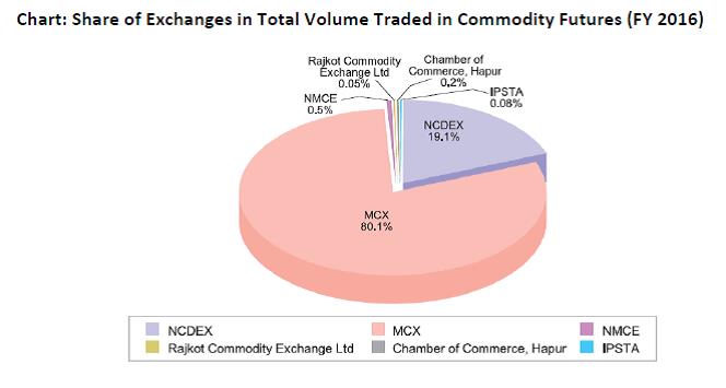 iiTurnover/Volume traded/Open Interest The aggregate turnover at all the exchanges in the domestic commodity derivatives segment increased by 9.1 per cent to ₹ 66,96,380 crore in 2015-16 from ₹ 61,35,672 crore in 2014-15. Further, the aggregate turnover at all the exchanges in the domestic commodity derivatives segment for 2016-17 (till February 2017) was ₹ 59,83,146 crore. The highest share in the all-India turnover of approximately 90.7 per cent was recorded at MCX, followed by 8.9 per cent at NCDEX and 0.4 per cent at NMCE. The chart below shows the respective share of exchanges in the consolidated volume traded across exchanges for FY 2016. In terms of the total volume traded in Commodity futures, MCX held the dominant position with 80.1 per cent share, followed by NCDEX (19.1 per cent) and NMCE (0.5 per cent). ![]() MCX In 2015-16, the total turnover at MCX increased by 8.7 per cent to ₹ 56,34,194 crore compared to ₹ 51,83,707 crore in 2014-15. Further, the total turnover at MCX in 2016-17 (till February end) is ₹ 54,25,289 crore. Bullion with the highest share in turnover witnessed a decline of 3.9 per cent in 2015-16 over 2014-15. As compared to 2014-15, turnover in energy increased by 17.7 per cent in 2015-16. The metals segment recorded an 18.1 per cent increase in turnover in 2015-16 while the agriculture segment witnessed a 10.4 per cent increase in turnover. Open interest at the exchange increased from ₹ 8,715 crore in 2014-15 to ₹ 9,080 crore in 2015-16. NCDEX At NCDEX, the total turnover in 2015-16 was ₹ 10,19,588 crore, representing an increase of 12.8 per cent from ₹ 9,04,063 crore in 2014-15. Further, the total turnover at NCDEX in 2016-17 (till February end) is ₹ 5,32,775 crore which represents the sharp decline. Turnover in the agriculture segment witnessed an increase of 14.7 per cent in 2015-16, while that in bullion declined by 36.5 per cent in 2015-16 over the previous year. Open interest at the exchange declined from ₹ 6,087 crore in 2014-15 to ₹ 4,703 crore in 2015-16. NMCE At NMCE, the total turnover in 2015-16, contributed entirely by agriculture segment was ₹ 29,368 crore, a decrease of 18.5 per cent from ₹ 36,040 crore in 2014-15. Further, the total turnover at NMCE in 2016-17 (till February end) is ₹ 25,083 crore. Open interest at the exchange increased from ₹ 46 crore in 2014-15 to ₹ 61 crore in 2015-16. Hapur Commodity Exchange At Hapur Commodity Exchange, which is a commodity specific exchange for rape/mustard seed, the total turnover in 2015-16 was ₹ 11,192 crore, an increase of 31.3 per cent from ₹ 8,521 crore in 2014-15. Open interest at the exchange increased from ₹ 13 crore in 2014-15 to ₹ 23 crore in 2015-16. Rajkot Commodity Exchange Ltd. At the Rajkot Commodity Exchange Ltd., which is a commodity specific exchange for Castor seed, the total turnover in 2015-16 was ₹ 1,976 crore, a decrease of 37.5 per cent from ₹ 3,163 crore in 2014-15 (Table 2.54). At IPSTA, the commodity specific exchange for pepper, the total turnover in 2015-16 was ₹ 62 crore, a decrease of 65.2 per cent from ₹ 178 crore in 2014-15. Product Segment-wise Turnover/Volume traded Of the aggregate all India turnover, 88.6 per cent was contributed by non-agri commodities while the remaining 11.4 per cent was contributed by agri commodities. As against the previous years, there has been a distinct shift in the relative shares of traded commodity groups at MCX. The share of bullion, the dominant product segment, declined from 41.5 per cent in 2014-15 to 36.7 per cent in 2015-16 and further to 35.5 percent in 2016-17 (till February end). Energy contributed a 32.8 per cent share in turnover followed by metal at 29.3 per cent and agriculture at 2.3 per cent. At NCDEX, agriculture had the highest share in turnover at 98 per cent followed by bullion at 2 per cent in 2015-16 and nearly 100 percent in 2016-17 (till February end). At NMCE, the entire turnover was that of the agriculture segment. Agri Commodities On the whole, 27 agri commodities were traded at the Indian commodities futures exchanges, of which NCDEX traded 19, MCX (6) and NMCE (11) during 2016-17. A few commodities like kapas, castor seed, mustard seed, cotton and guar seed, etc., were traded at more than one exchange. In addition to the above, the regional exchanges are commodity specific as the Rajkot Commodity Exchange Ltd. trades castor seed; the Hapur Commodity Exchange, trades mustard seeds, and IPSTA trades pepper. At MCX, the share of agri commodities in the total turnover for 2016-17 was a miniscule 2.3 per cent. Crude palm oil (CPO) was the most traded agri commodity with a percentage share of 0.79 per cent in the total turnover at the exchange. Apart from CPO, mentha oil, cotton, cardamom and kapas were the only agri commodities traded at MCX during 2015-16. At NCDEX, the share of agri commodities in the total turnover for 2015-16 was almost 100 percent. The top 10 agri commodities contributed 89.7 per cent of the turnover of the exchange. Chana was the most traded agri commodity with a percentage share of 15.7 per cent in the total turnover at the exchange. Soya oil with a share of 14.0 per cent and guar seed with a share of 11.3 per cent were the other most traded commodities at NCDEX during the year. At NMCE, rape/mustard seed was the most traded agri commodity with 22.0 per cent share of per cent in the total turnover, followed by isabgul seed at 20.7 per cent. Non-Agri Commodities At MCX, in 2016-17 the share of non-agri commodities in the total turnover was 97.7 per cent. Crude oil was the most traded non-agri commodity with a percentage share of 29.8 per cent in the total turnover at the exchange. Gold was the other most traded commodity with a share in turnover of 22.1 per cent followed by silver at 14.7 per cent. Trading in non-agri commodities in NCDEX was negligible. List of sources: i SEBI PR No. 237/2015 dated September 28, 2015 ii Annual Report 2015-