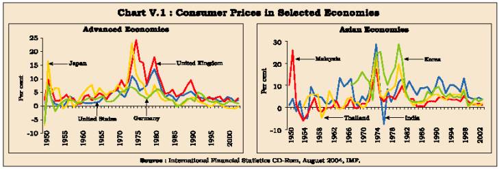 5.4 Low and stable inflation - called the 'Death of Inflation' - has been accompanied with a relatively higher stability in economic activity and the period has been termed as a NICE - Non-Inflationary Consistently Expansionary - decade (King, 2004). However, low levels of inflation can also be a source of concern. Inflation during 2001-03 had fallen to such low levels in various countries following the global slowdown that it raised concerns of a generalised deflation. Aggressive monetary policy easing, however, prevented a generalised deflation. More recently, with signs of economic recovery, central banks have started withdrawing monetary stimuli in a measured manner.