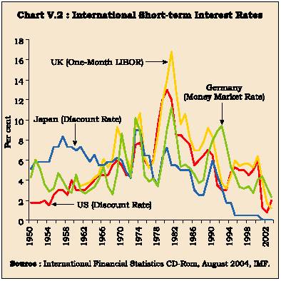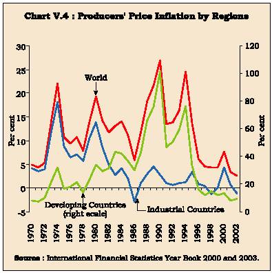 5.9 Since the late 1960s, expansionary fiscal policies and accommodative monetary policies contributed to a strong cyclical upswing in the global economy creating supply-demand imbalances in many non-fuel primary commodities. In the US, for instance, the Vietnam war and tax cuts expanded the fiscal deficit. Fiscal deficits in advanced economies expanded from 1.2 per cent of GDP during the 1960s to 3.4 per cent during the 1970s. Capacity constraints were already putting upward pressure on wages and prices and as the oil price shock hit in 1973, many countries pursued accommodative monetary policies to offset the adverse output and employment effects of the shock. Consequently, inflation surged to double digits in many countries including the US, the UK and Japan. In response, monetary policies were tightened but inflation persisted - the period of the 1970s has come to be called the 'Great Inflation' (Meltzer, 2004) (Table 5.2 and Chart V.1).