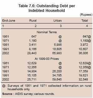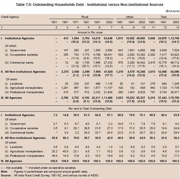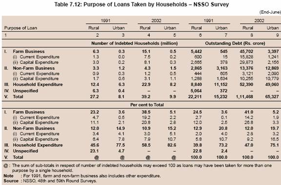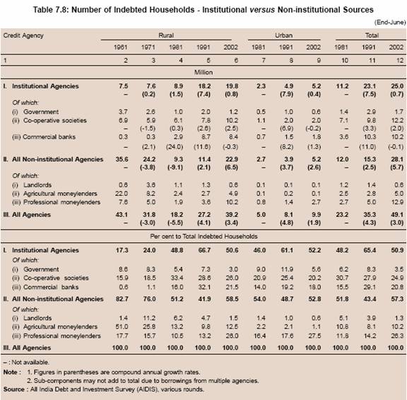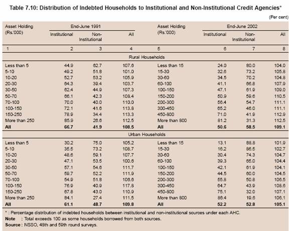 7.123 To sum up, according to the All India Debt and Investment Survey of the NSSO, the household indebtedness increased sharply between 1991 and 2002. This was mainly on account of sharp increase in consumption and other expenditure, which could not be easily financed from institutional sources. Data also suggest that in absolute terms, the number of households indebted to institutional sources, both in rural and urban areas, increased between 1991 and 2002. However, the proportion of households indebted to institutional sources and the share of institutional sources in households’ outstanding debt declined sharply between 1991 and 2002. A detailed analysis suggests that institutional agencies continued to increase credit to households between 1991 and 2002 more or less at the same rate as between 1981 and 1991. However, sharp increase in credit for consumption and other unproductive purposes from non-institutional sources resulted in a significant decline in the share of institutional sources in total number of indebted households and their outstanding debt.