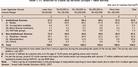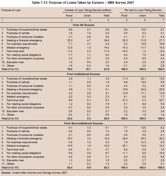 7.32 A significant portion of demand for credit by rural households arises in order to ease the financial burden of crop failures, illness or death, and health care. In the case of microenterprises, credit may be needed to achieve a reasonable and viable scale of activities. The rising entrepreneurship spanning rural, semi-urban and urban areas, particularly in the unorganised and informal sectors may give rise to large potential demand for credit. The evidence on the demand for credit in India suggests that medical and financial emergencies are the major reasons for household borrowings. Medical emergencies were particularly high for the lowest income quartile (IIMS, 2007)2 . Thus, the difficulty in obtaining finance from formal sources has major social implications.