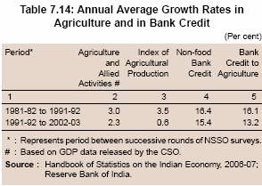 7.105 From the above analysis, it is evident that credit delivery from formal financial institutions to the relatively excluded segments has improved significantly in recent years due to various initiatives by the Reserve Bank and the Government. As a result, overall credit to agriculture by all credit institutions grew at an annual compound rate of 26.5 per cent between 2002-03 and 2007-08 as compared with 16.8 per cent between 1991-92 and 2001-02 (Table 7.24).