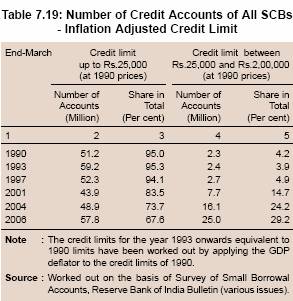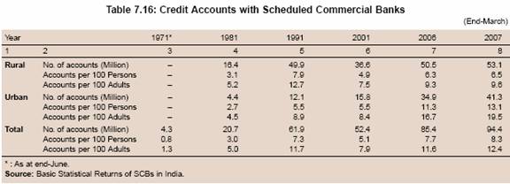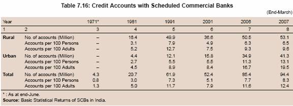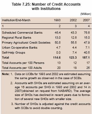 7.158 The reference year for the latest NSSO data was 2002. An analysis of more recent BSR data reveals that there has been a distinct improvement in credit penetration (credit accounts per 100 persons) and credit flow to the rural sector in general and to agriculture, in particular, since the early 2000s, that is, after the release of the NSSO data. Responding to the initiatives taken in recent years, the number of credit accounts with all organised financial institutions (commercial banks, RRBs, UCBs, PACS, MFIs and SHGs) per 100 adults improved from 18 in 2002 to 25 in 2007.